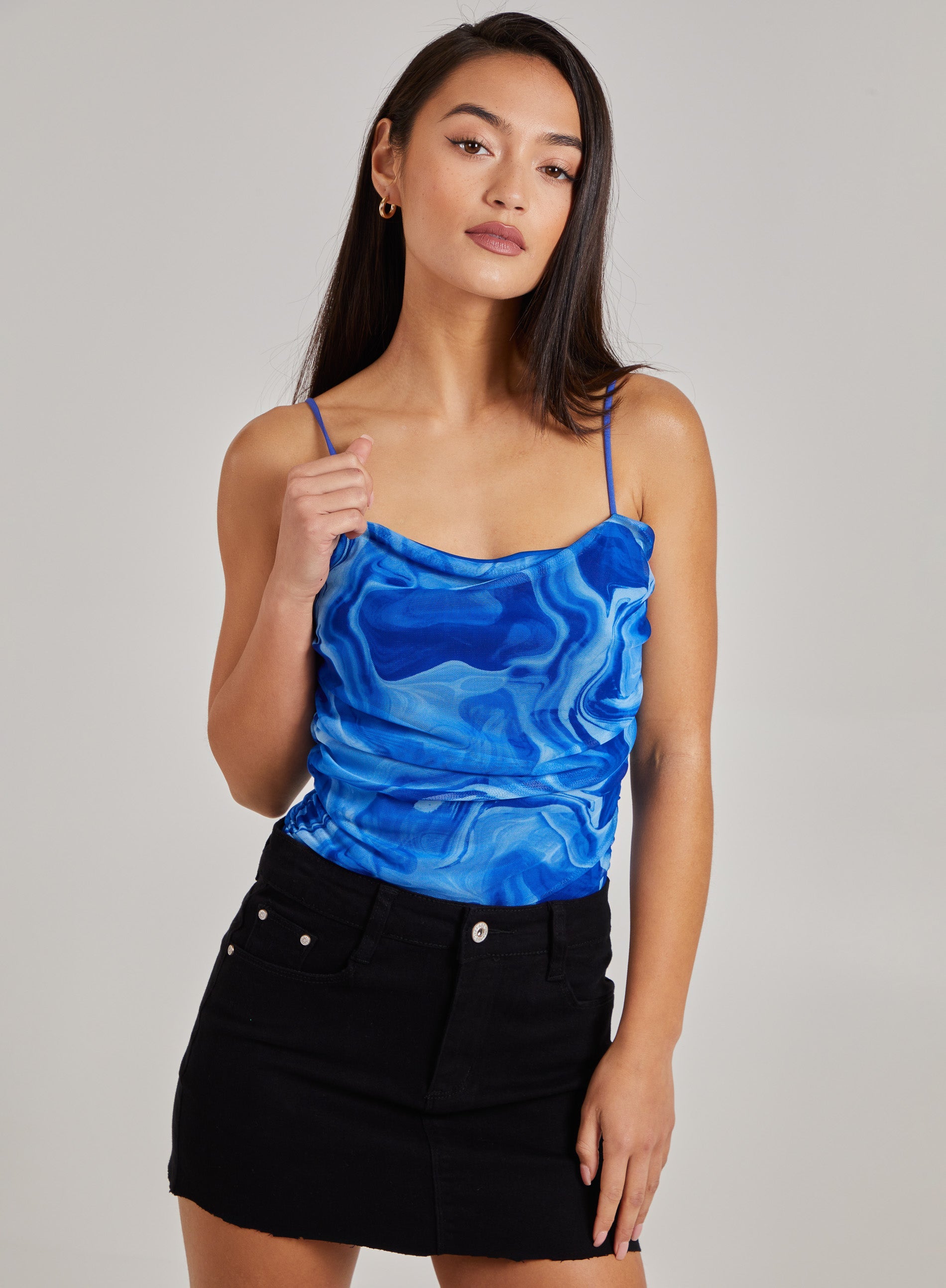 Mesh Marble Ruched Cami Strap Bodysuit
